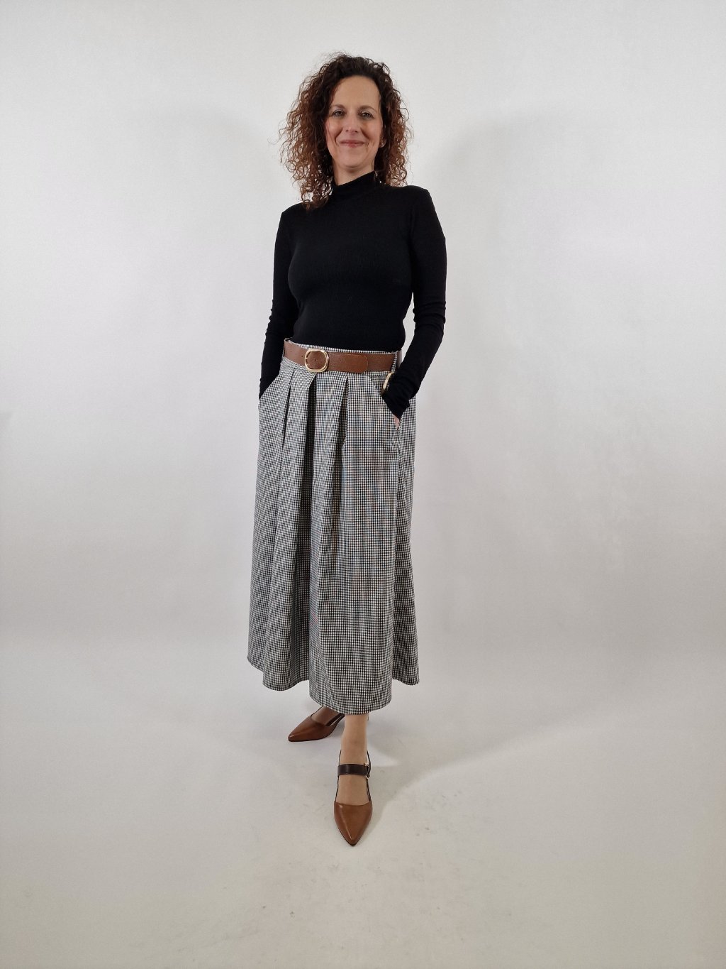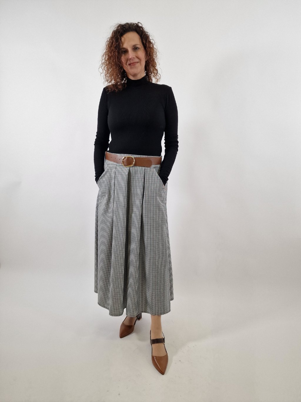 Stylová dámská áčková sukně v univerzální velikosti 36–40. Nabíraný střih krásně sedí na postavě, zadní část pasu je stažená v gumce pro maximální pohodlí. Praktické kapsy a pásek dělají z této sukně skvělý kousek pro každodenní nošení i elegantnější kombinace.