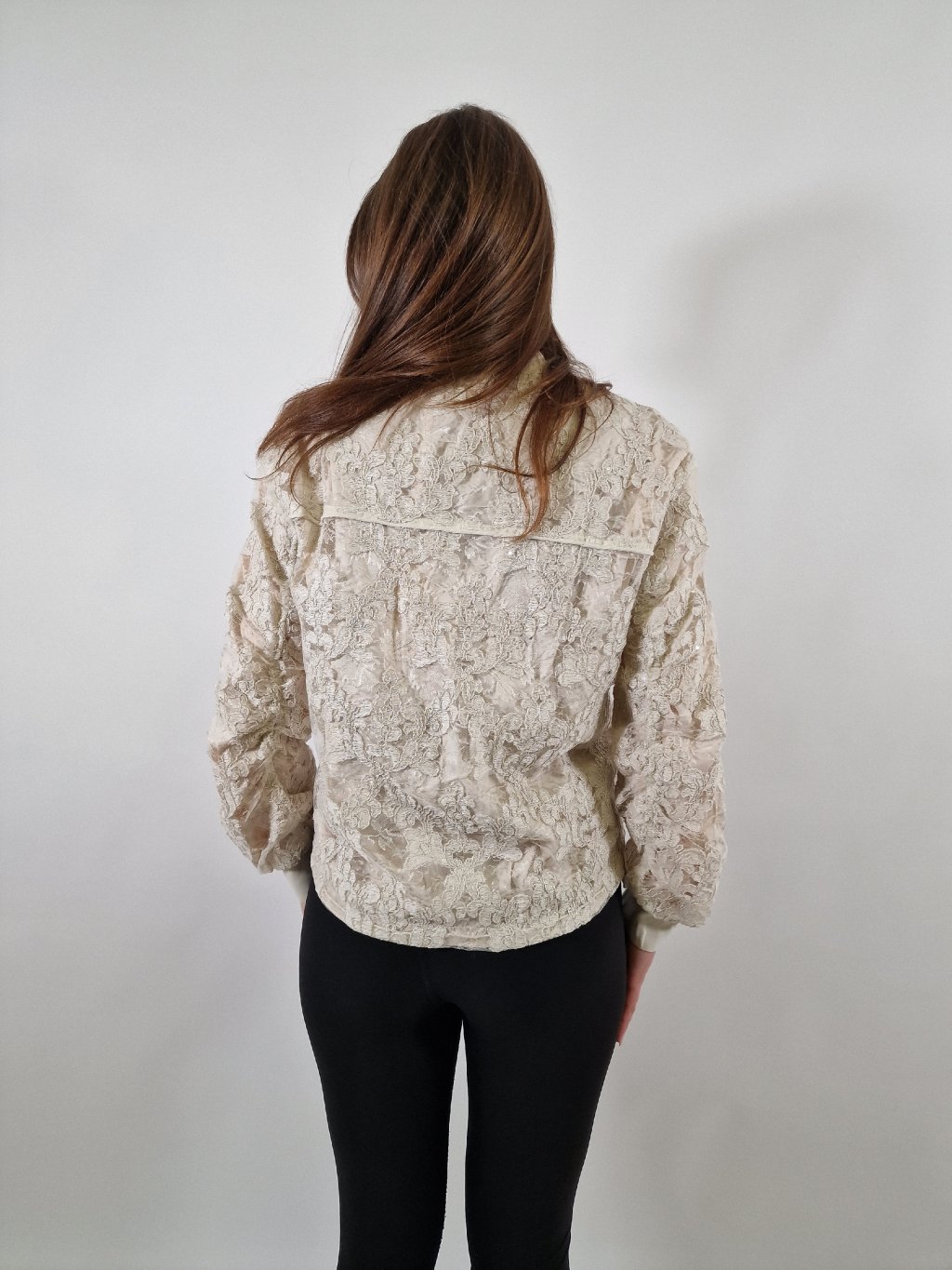 Stylová dámská blejzr bunda zdobená krajkou pošitou jemnými flitry a stříbrnou nitkou, která dodává modelu luxusní vzhled. Bunda je podšitá, má praktické kapsy a ve spodní části po stranách možnost stažení pro lepší přizpůsobení postavě. Skvěle doplní jak elegantní, tak i společenský outfit.