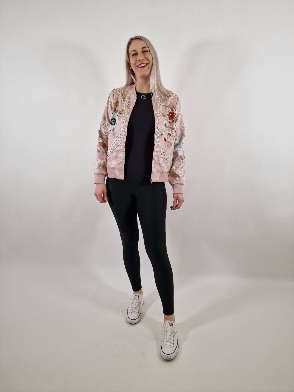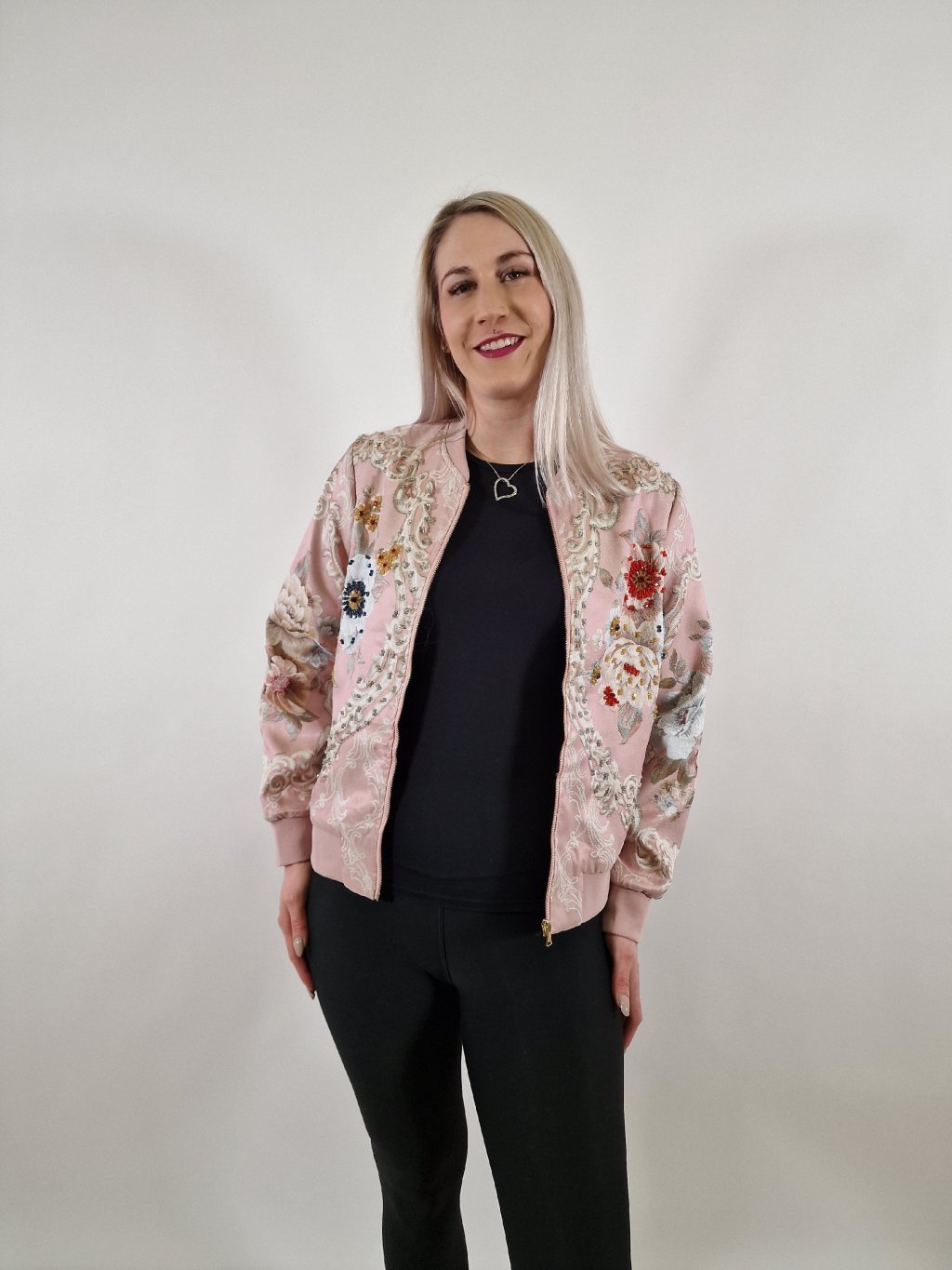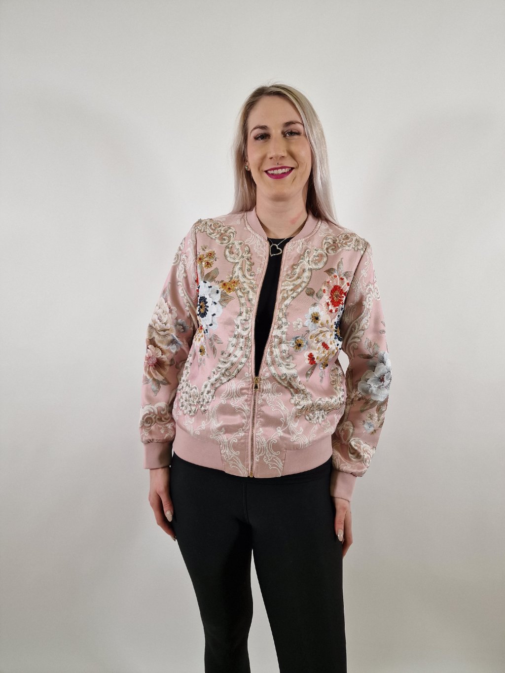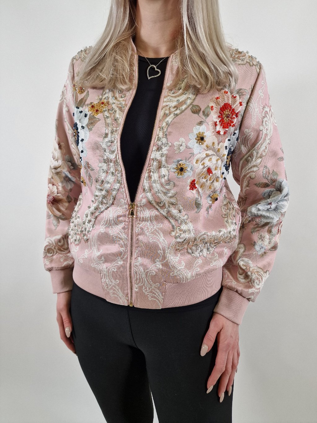 Krásná dámská bunda zdobená korálkovou aplikací, která dodává modelu originální a elegantní vzhled. Bunda je podšitá, má praktické kapsy a pohodlný střih. Skvěle se hodí k džínům, šatům i elegantnějším outfitům. Ideální na jaro i podzim.