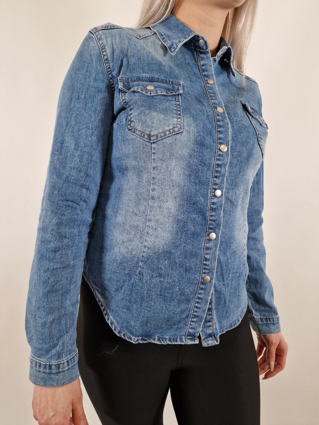 Dámská denim košile z příjemného strečového materiálu, která se skvěle nosí po celý den. Zapínání na druky dodává košili moderní vzhled, střih je pohodlný a dobře sedí. Ideální kousek jak k džínám, tak i k sukni nebo kalhotám.