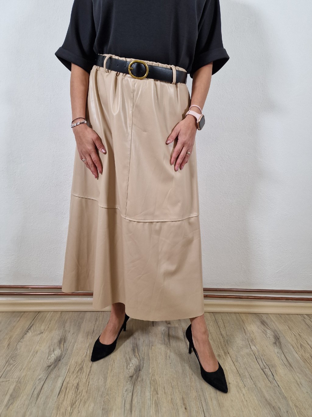 Dámská maxi koženková sukně s páskem HG představuje spojení elegance a originality. Vyrobena z kvalitního materiálu (60% polyuretan, 40% polyester), který imituje kůži, dodává sukně moderní a luxusní vzhled. Áčkový střih lichotí postavě a elastický pas zaručuje pohodlné nošení. Díky univerzální velikosti 36–42 se skvěle přizpůsobí různým typům postavy. Pásek zvýrazní pas a dotváří stylový vzhled vhodný pro běžné i společenské nošení.