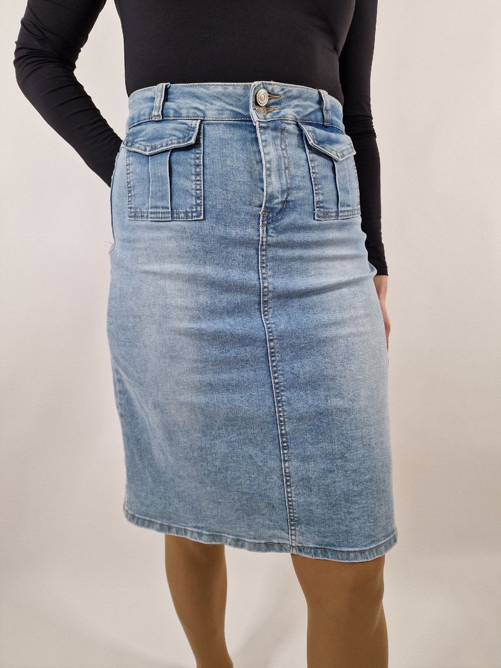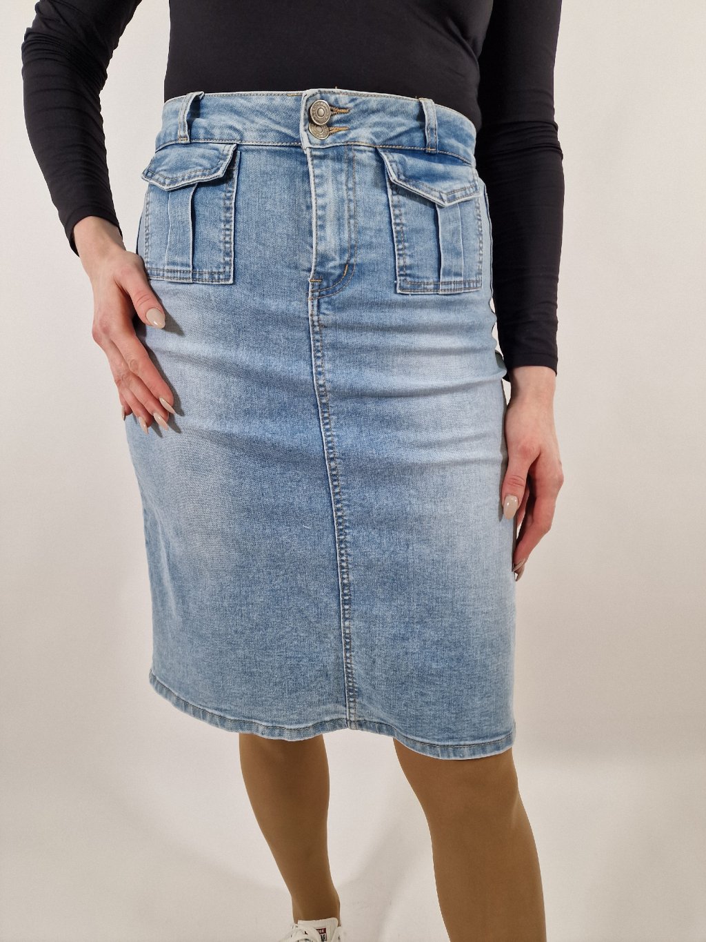 Stylová dámská denim sukně z pružného materiálu, která je velmi pohodlná na nošení. Díky vyššímu podílu bavlny je příjemná na tělo a elastan zajišťuje flexibilitu při pohybu. Sukně má praktické kapsy a skvěle se hodí jak k teniskám, tak k elegantnějším botám.