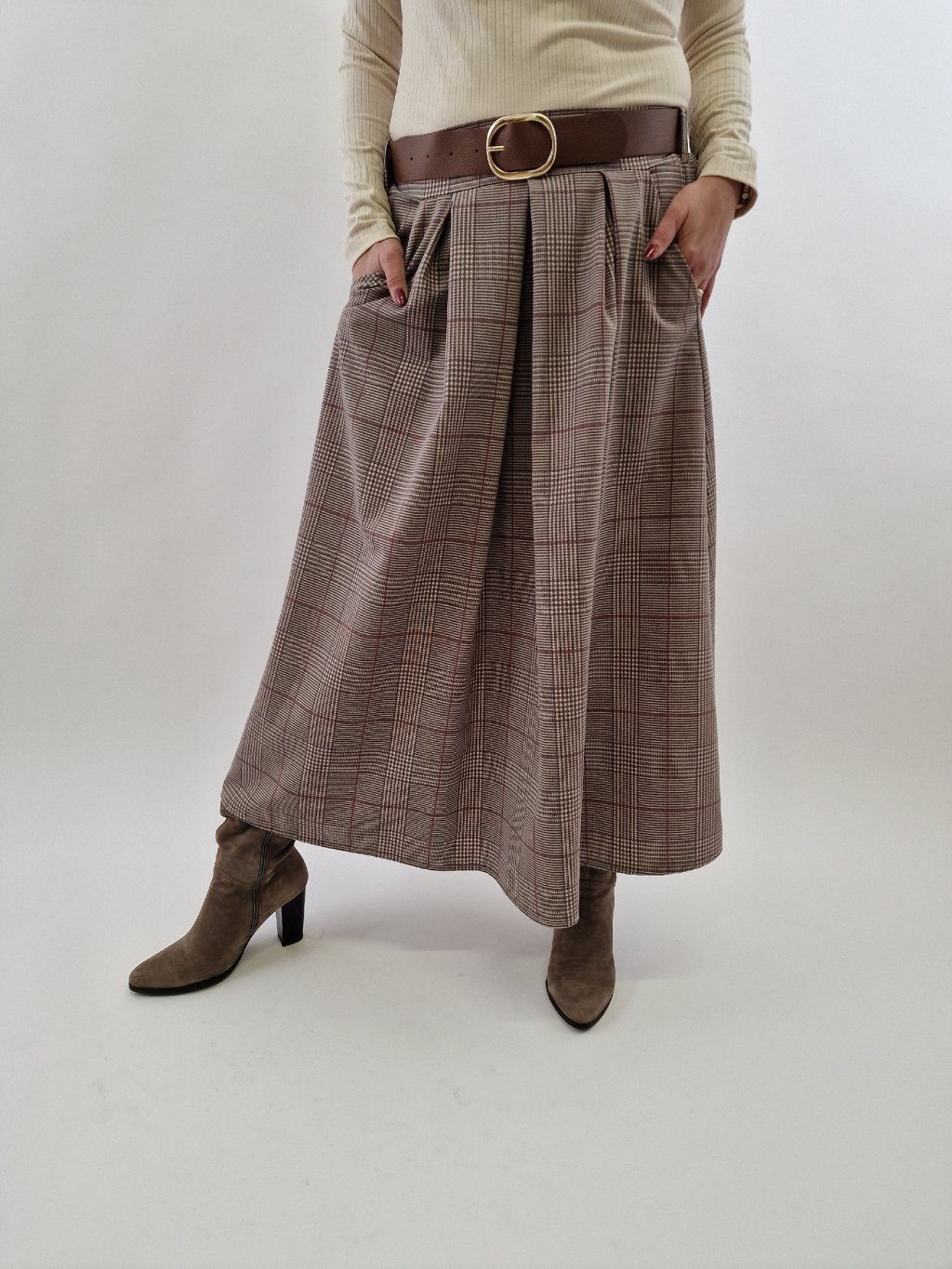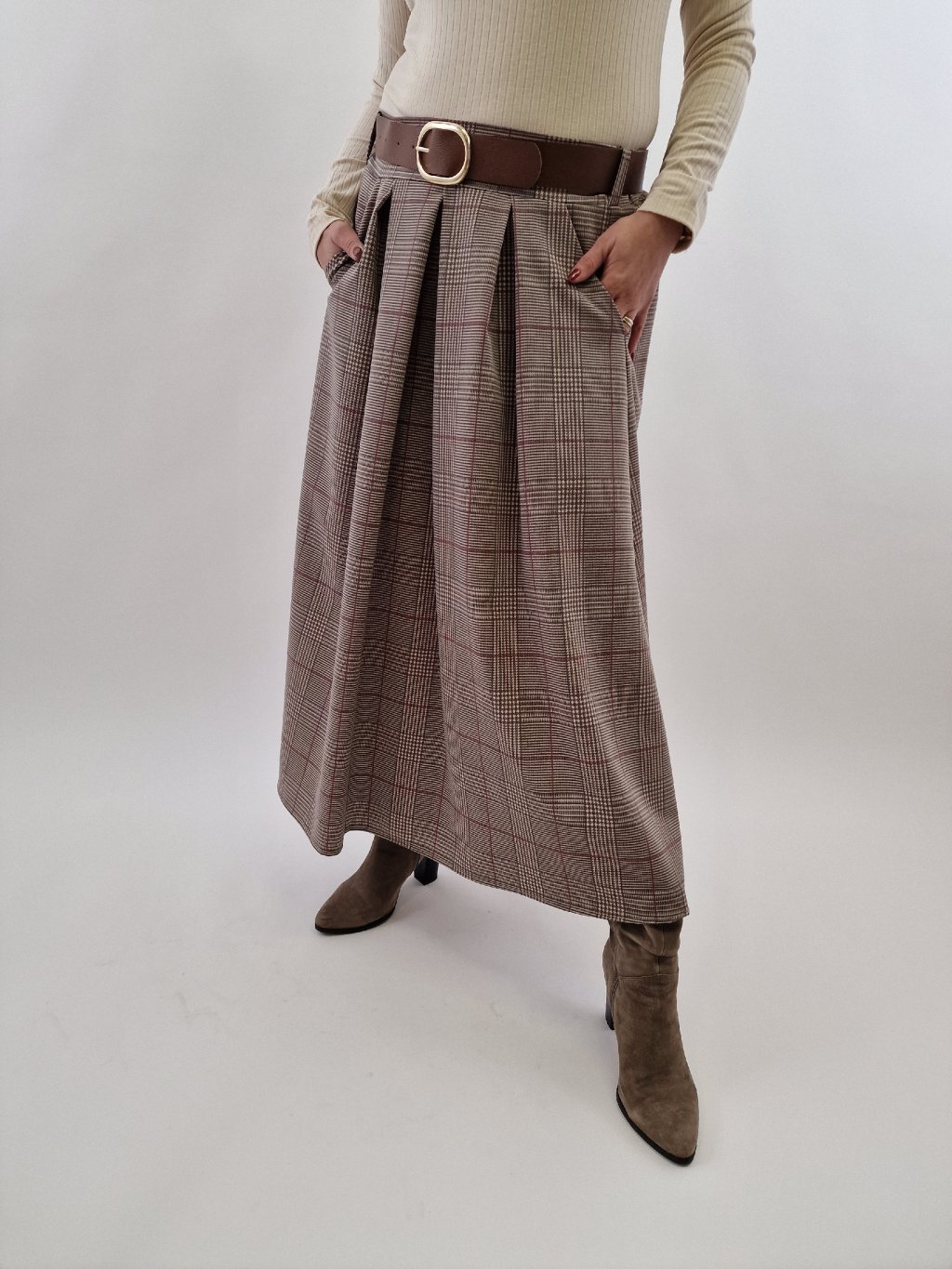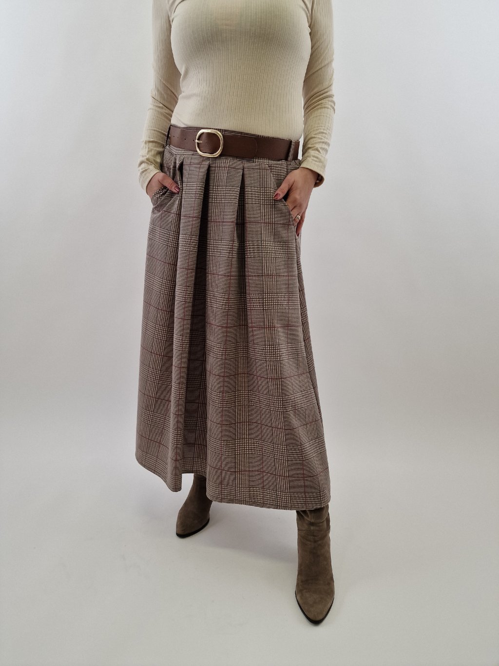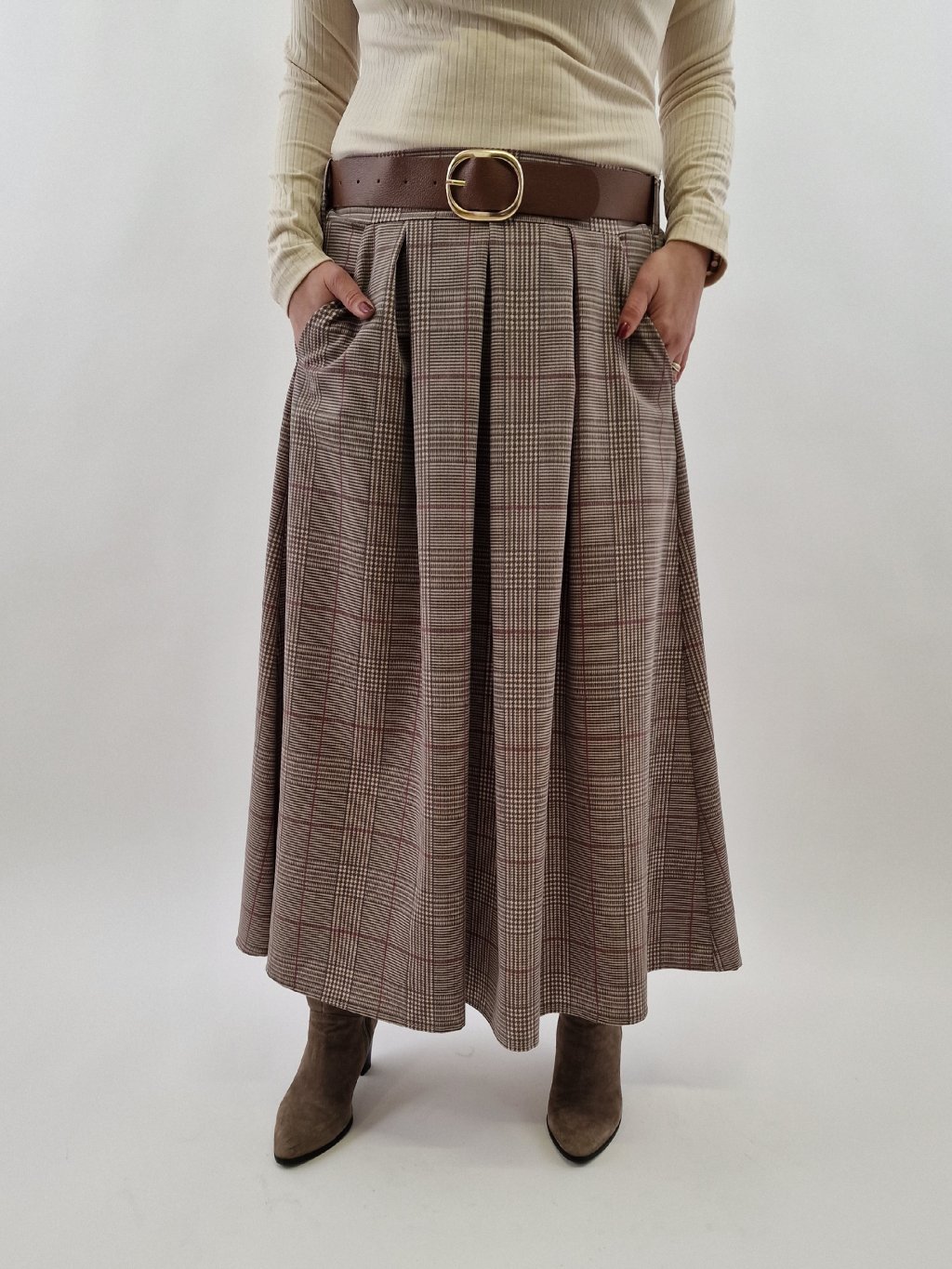 Dámská káro sukně s páskem Thodami spojuje styl a pohodlí. Vyrobena z pružného materiálu, který zajišťuje komfort při nošení, sukně má praktické kapsy a pásek pro možnost zvýraznění pasu. Zadní strana pasu je stažená v gumě, což usnadňuje přizpůsobení různým postavám. Ideální volba pro každodenní i elegantní outfity.