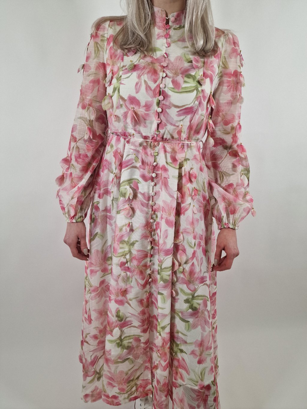 Elegantní dámské boho šaty s květinovým vzorem, které zaujmou svým zdobným provedením. Áčkový střih lichotí postavě, šaty mají pásek pro zvýraznění pasu, praktické kapsy, spodničku a zapínání na zip v zadní části. Ideální volba na slavnostní události i letní dny.