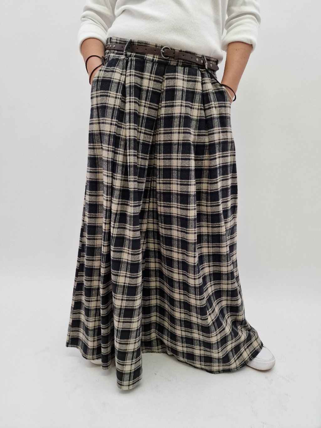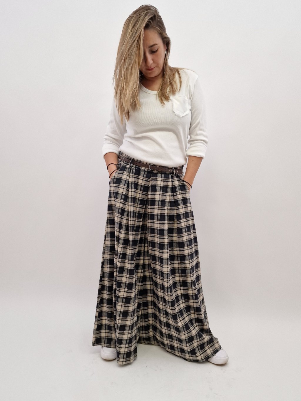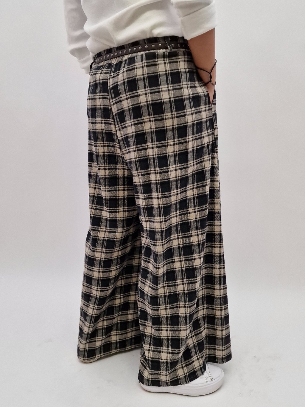 Stylové dámské široké káro kalhoty v teplém provedení jsou ideální volbou pro podzimní a zimní dny. Mají elegantní střih s páskem, kapsami a pohodlným pasem, který se přizpůsobí postavě. Hřejivý směsový materiál poskytuje komfort a příjemný pocit při nošení.