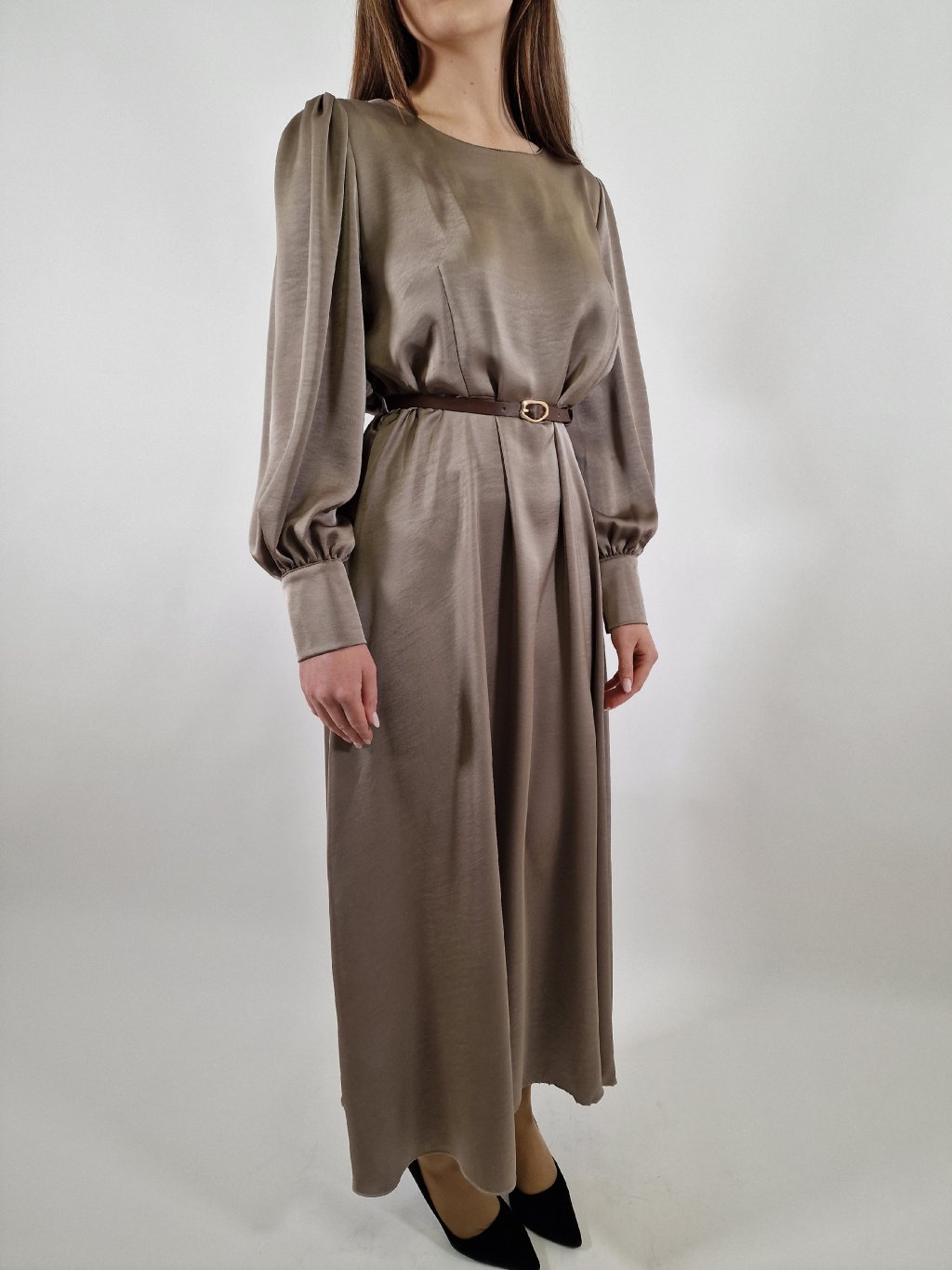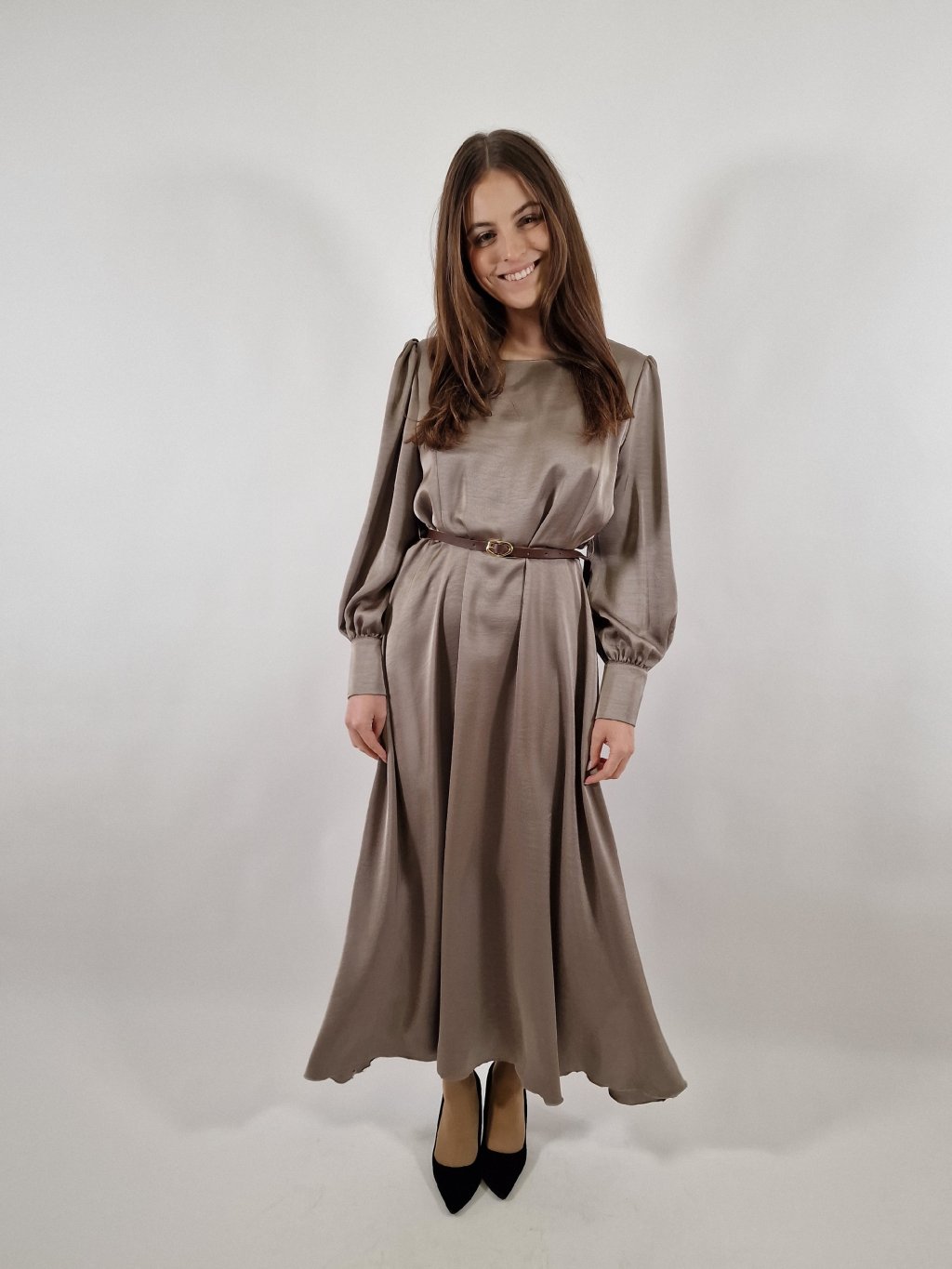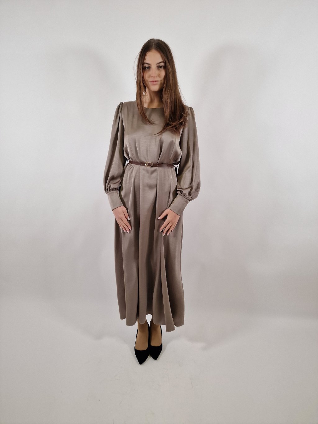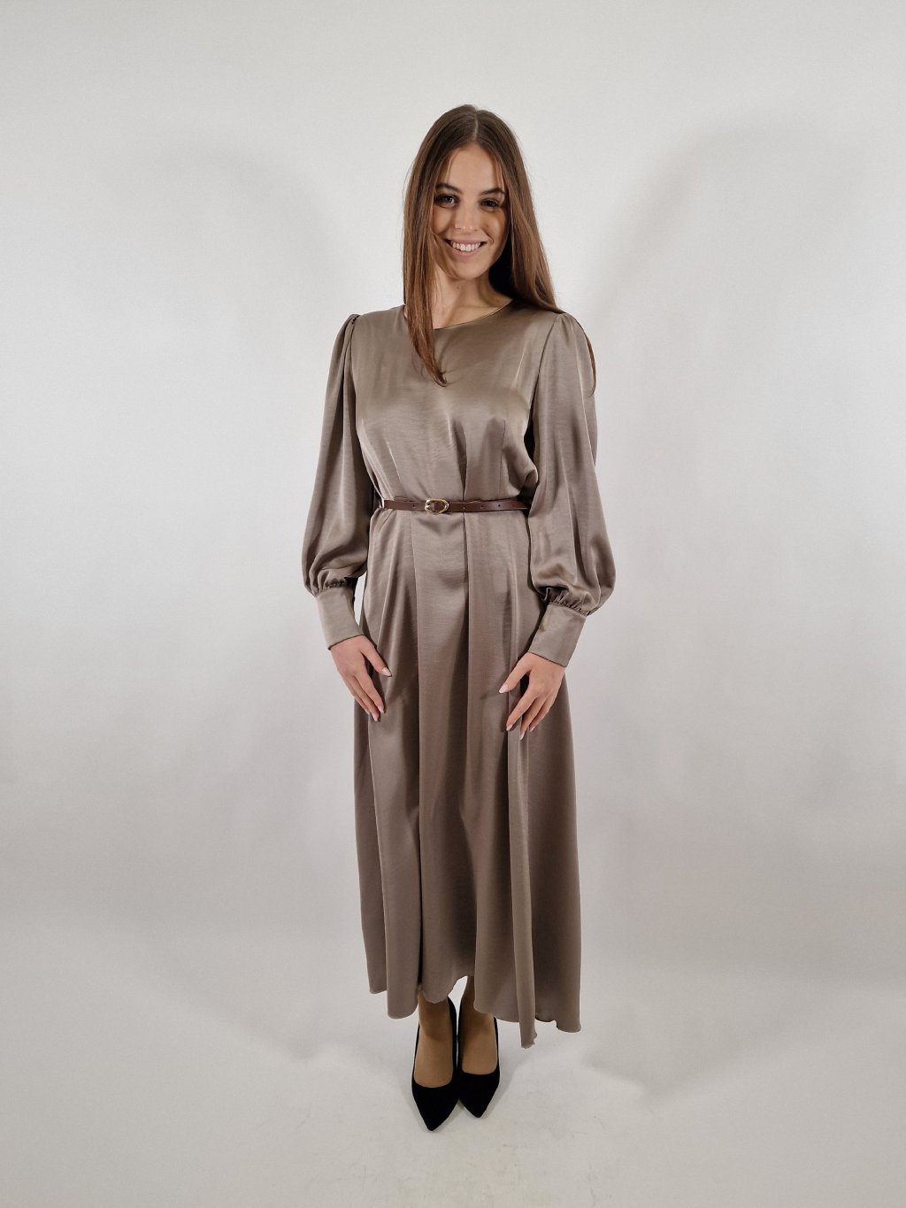Krásné dámské dlouhé šaty ze sametového materiálu, který působí luxusním dojmem a zároveň je lehký a příjemný na nošení. Áčková sukně krásně splývá, pásek zvýrazní pas a celkový střih lichotí postavám velikostí 38–42. Ideální volba na společenské události i elegantní večerní nošení.