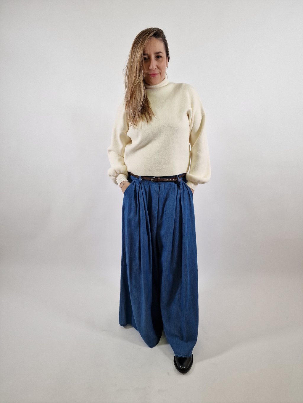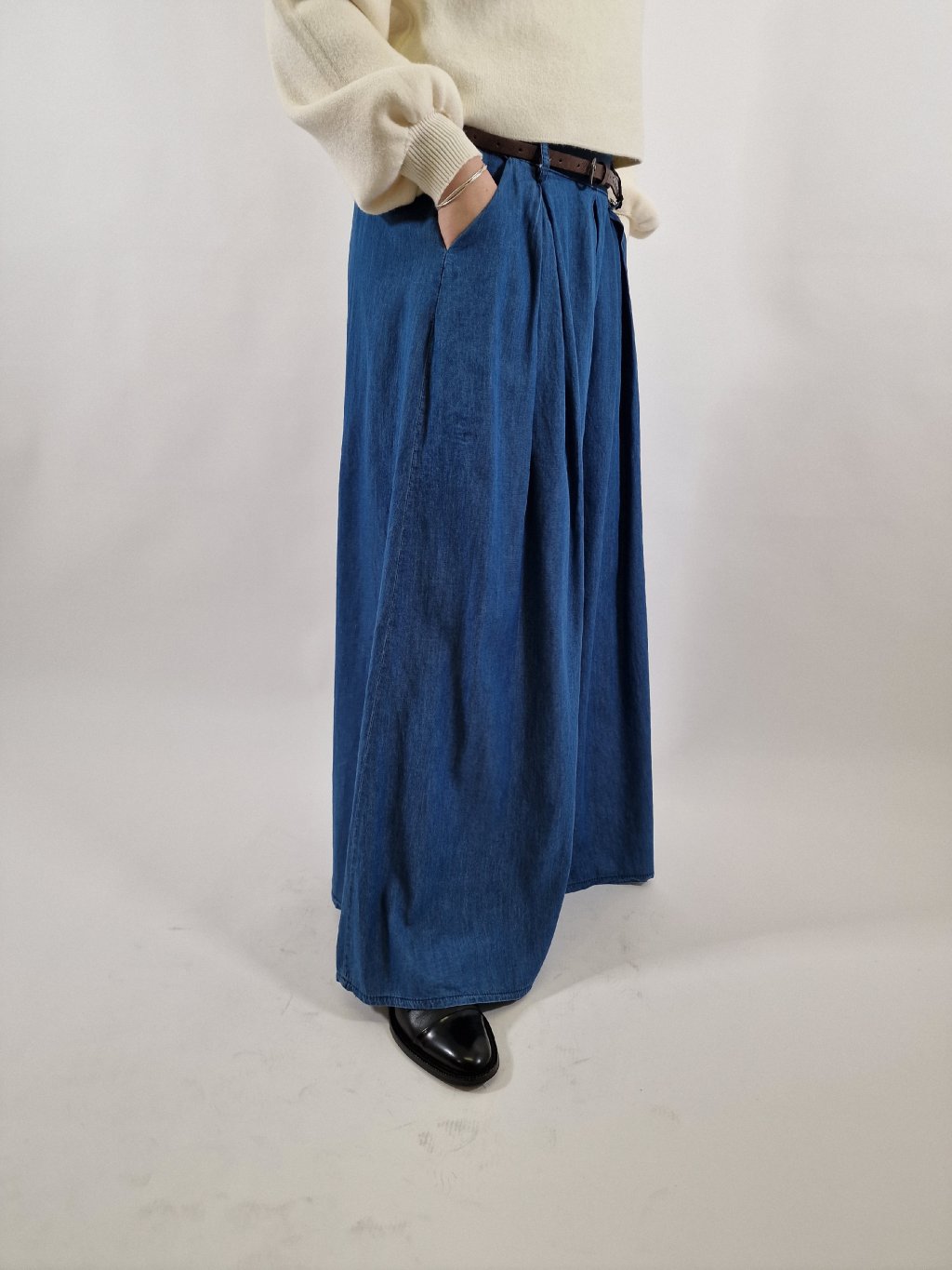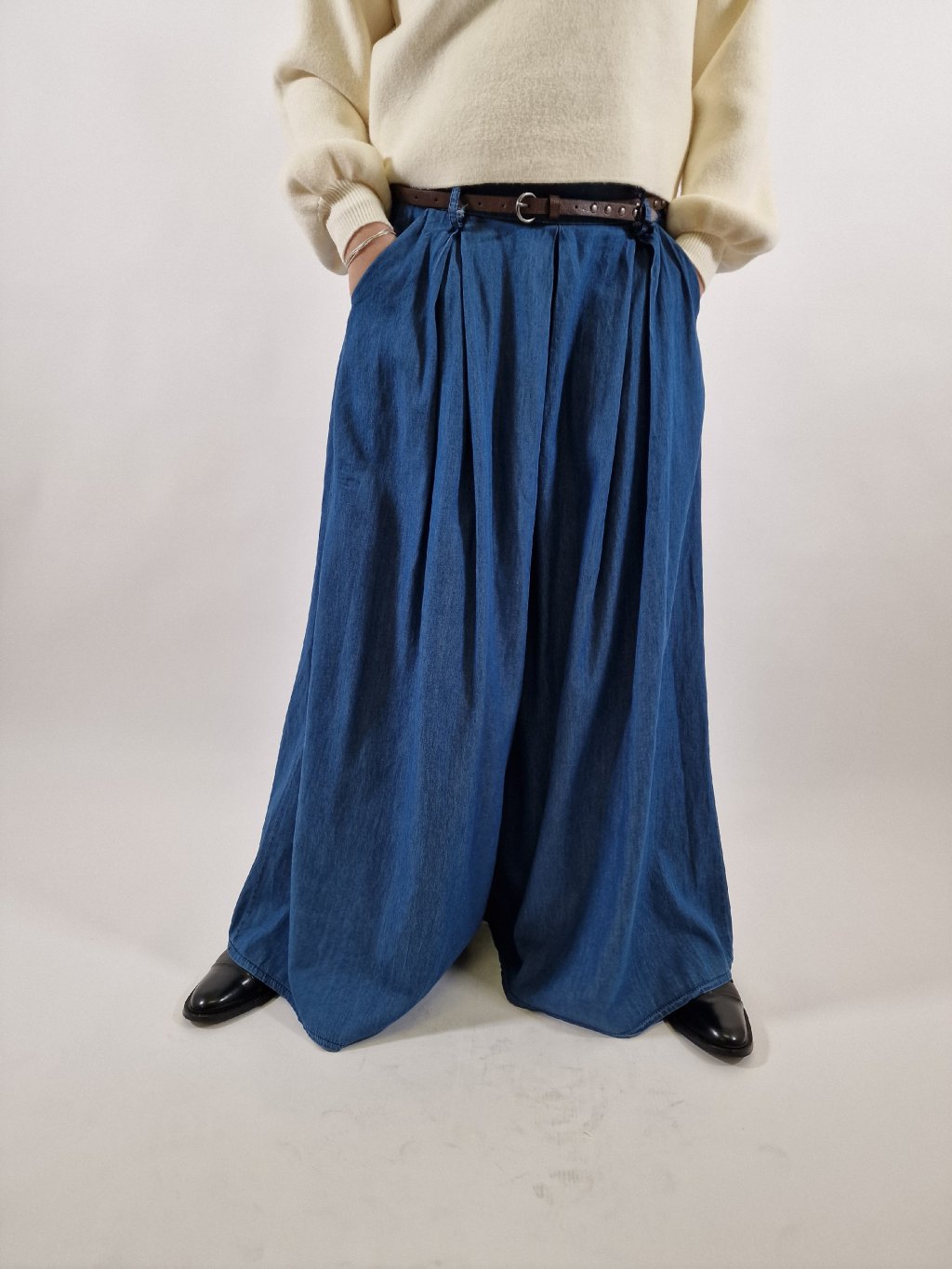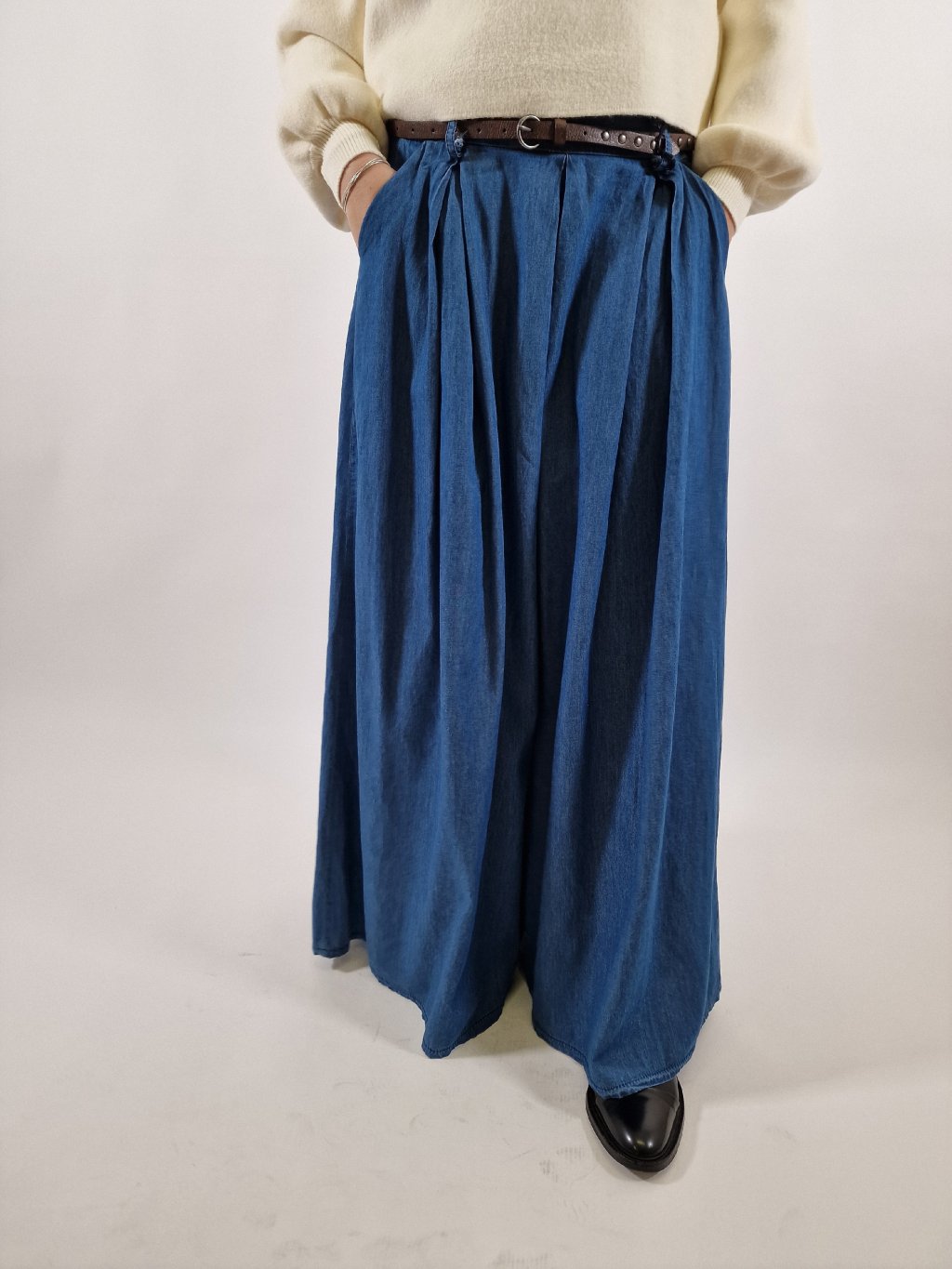 Stylové plátěné maxi kalhoty LEA s širokými nohavicemi, které vytvářejí efekt kalhotové sukně. Mají praktické kapsy a součástí je pásek pro zvýraznění pasu. Zadní část pasu je stažená do gumy, takže se krásně přizpůsobí postavě a zajistí maximální pohodlí při nošení. Ideální volba pro každodenní i elegantnější outfit.