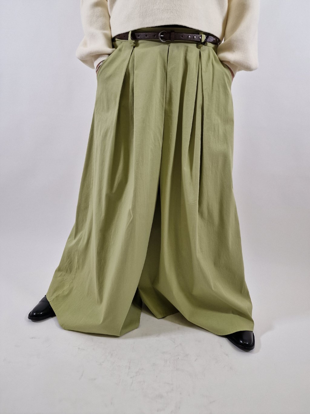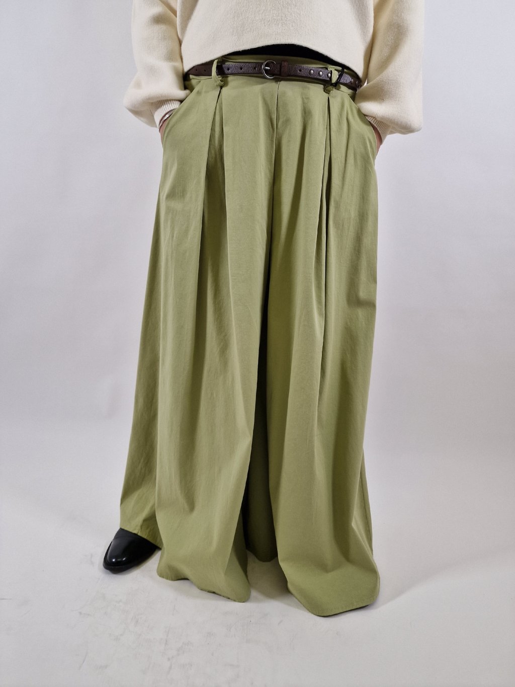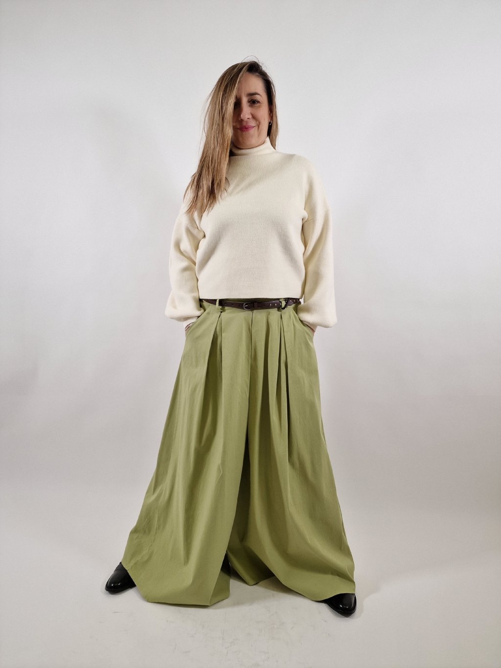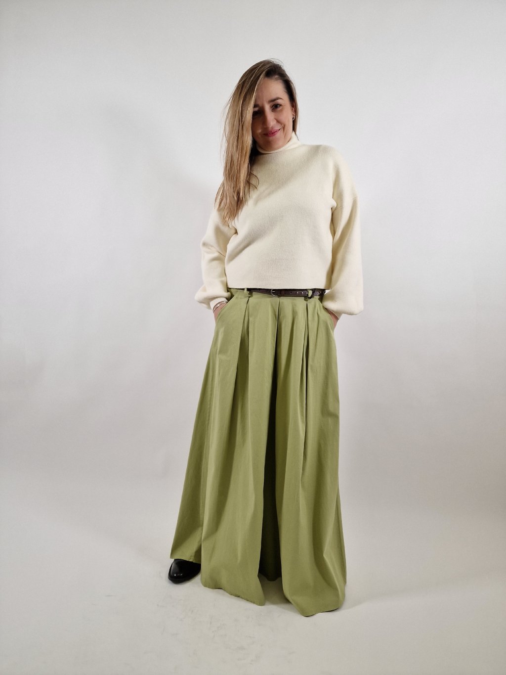 Stylové plátěné maxi kalhoty LEA s širokými nohavicemi, které vytvářejí efekt kalhotové sukně. Mají praktické kapsy a součástí je pásek pro zvýraznění pasu. Zadní část pasu je stažená do gumy, takže se krásně přizpůsobí postavě a zajistí maximální pohodlí při nošení. Ideální volba pro každodenní i elegantnější outfit.