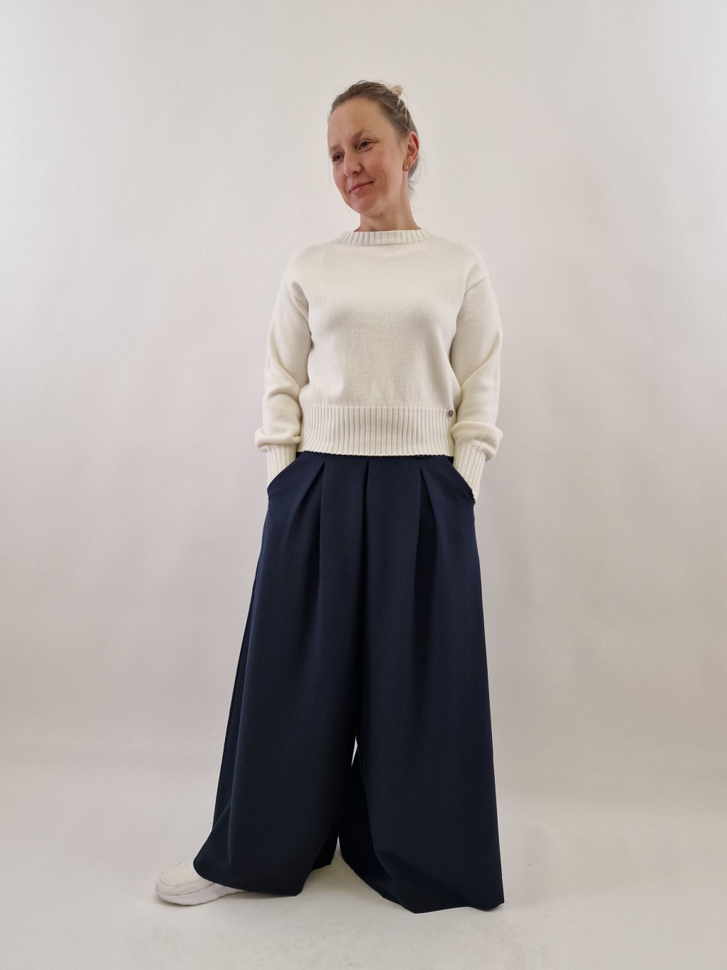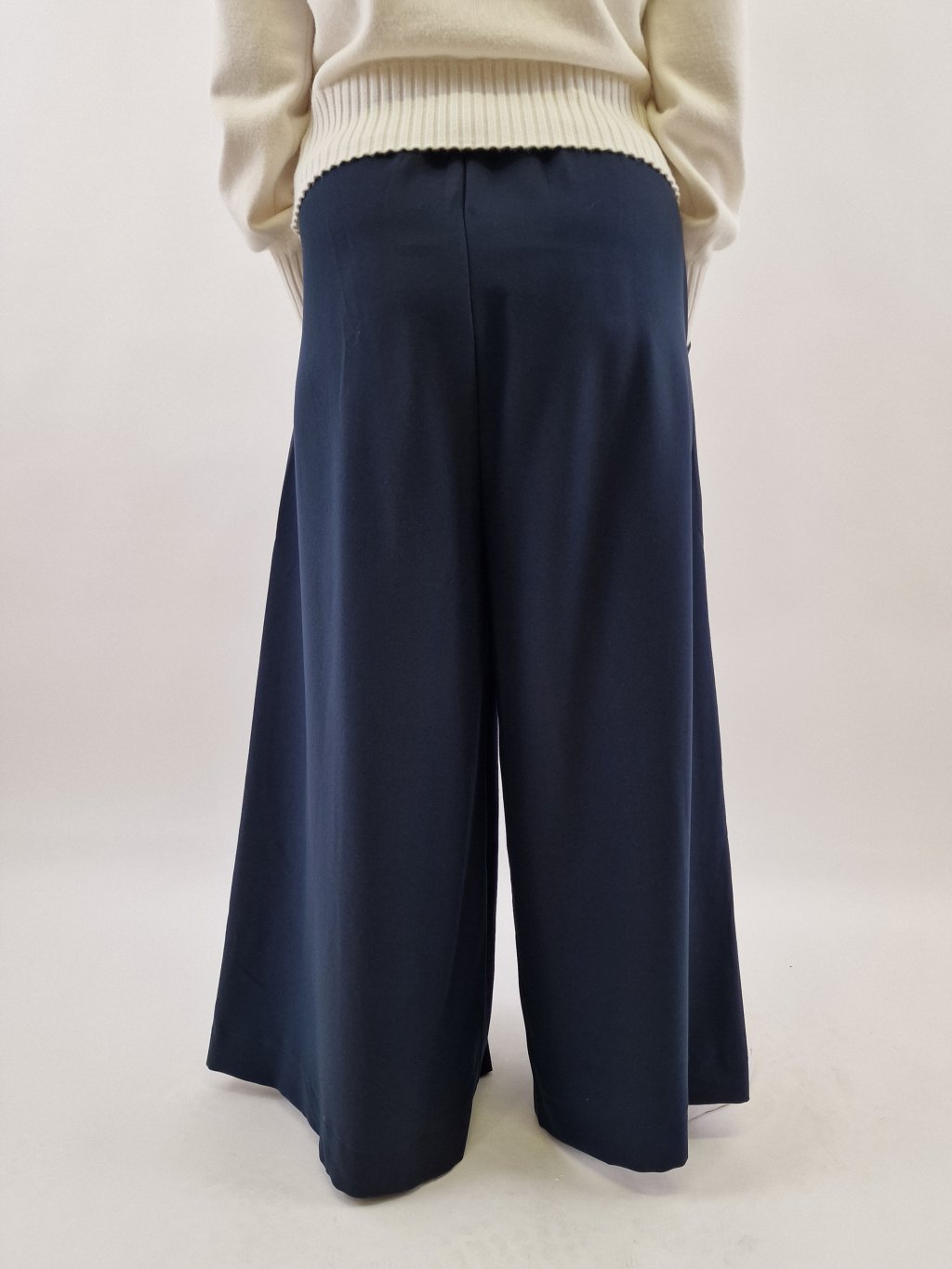 Moderní široké sukňové kalhoty v pohodlném střihu, který skvěle padne díky jemně strečovému materiálu a zadní gumě v pase. Kalhoty mají také praktické kapsy a působí velmi žensky, přesto pohodlně. Ideální pro každodenní nošení i elegantnější outfit.