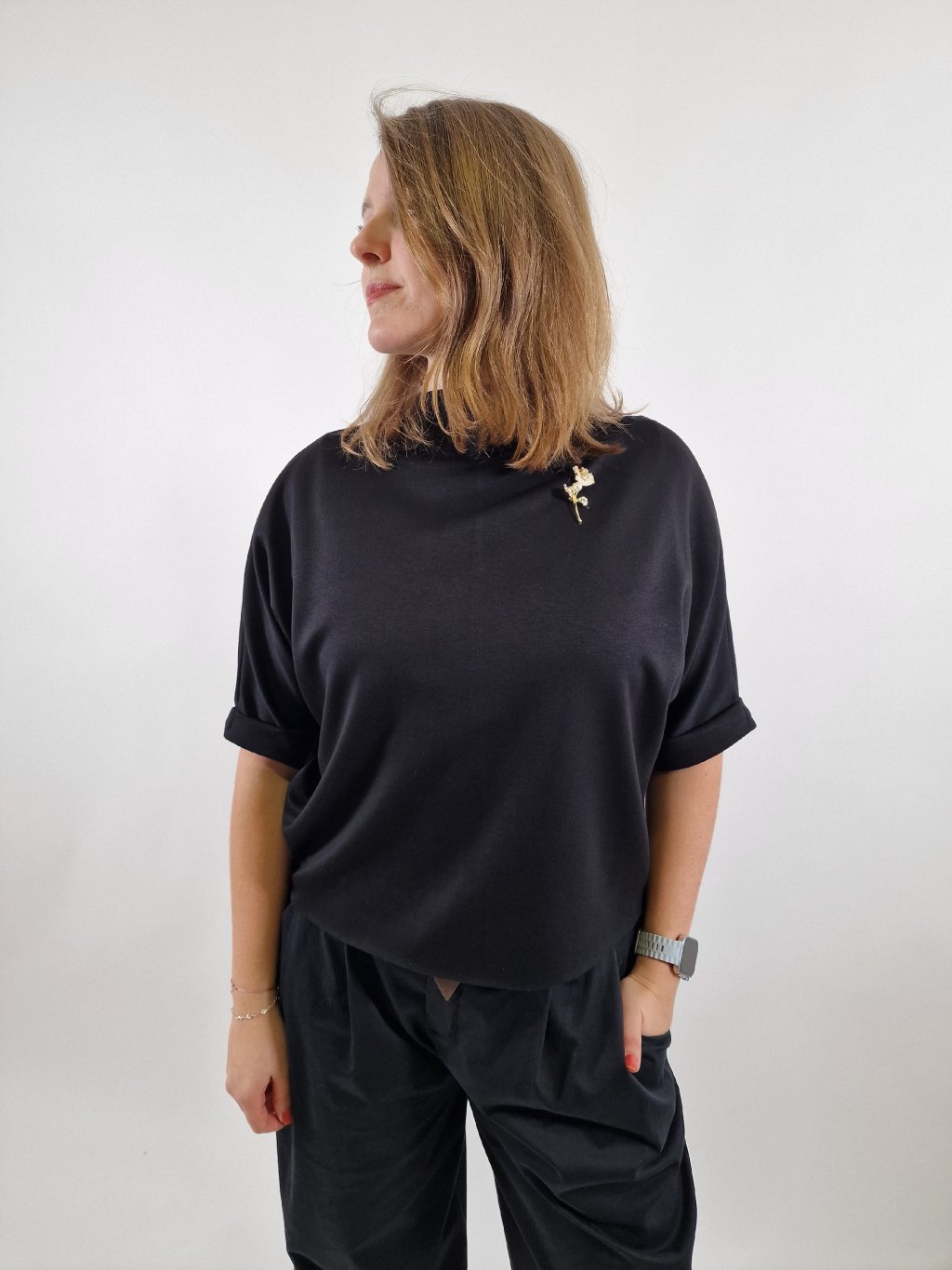 p>Krásný dámský top v oversize střihu, který zaujme stylovou broží jako výrazným detailem. Díky pružnému materiálu je velmi pohodlný a příjemný na nošení. Volnější střih lichotí postavě a umožňuje snadné kombinování s kalhotami, džínami i sukní – ideální pro ležérní i elegantnější outfit.