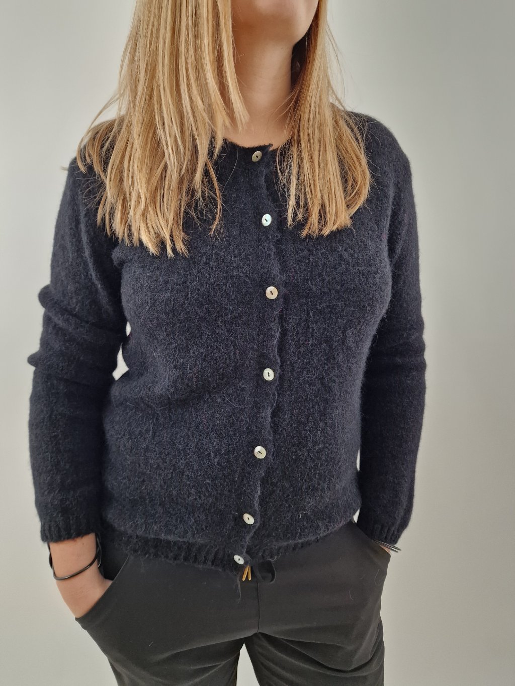 Krásný propínací svetr s podílem baby alpaky, která dodává maximální jemnost a hřejivost. Univerzální střih sedí velikostem 38–42, skvěle se kombinuje k běžným outfitům i elegantnějším kouskům.