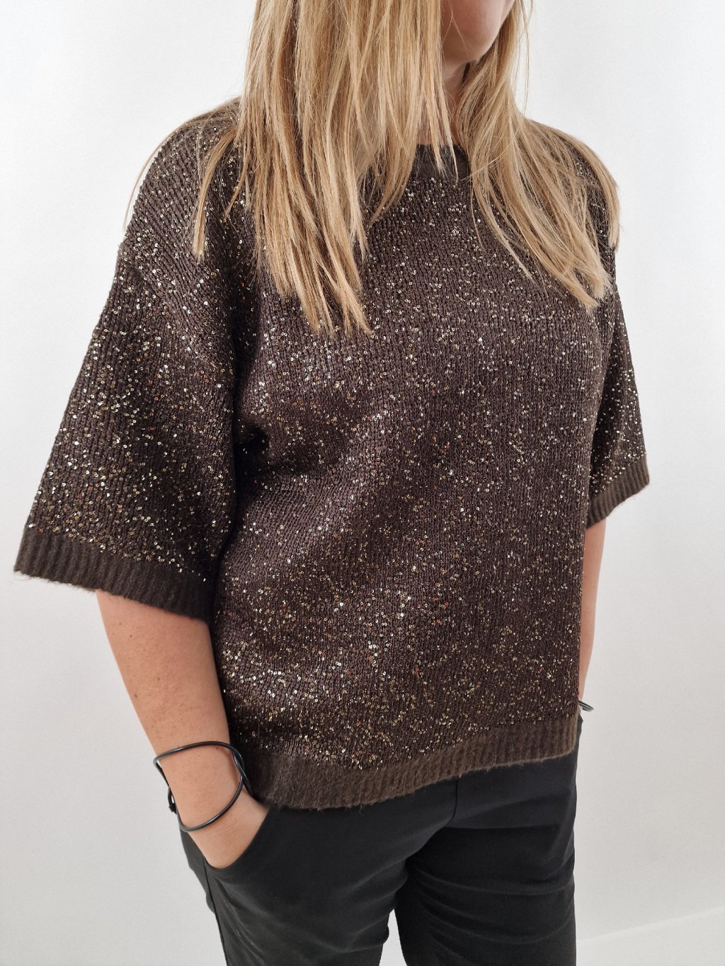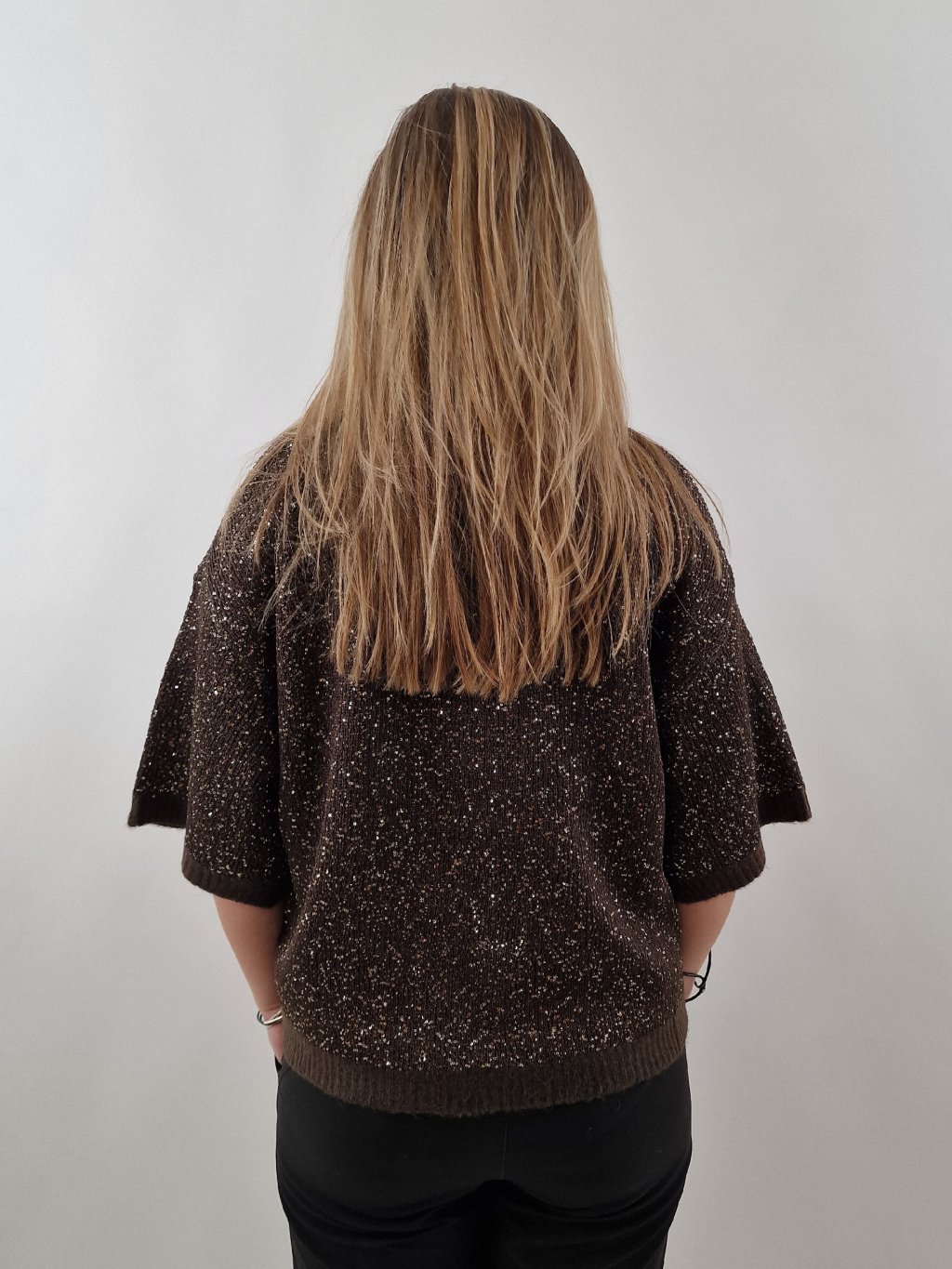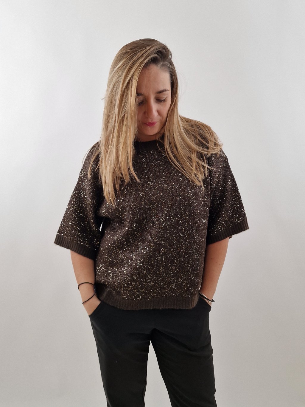 Stylový třpytivý svetr Top s příjemným materiálem kombinujícím polyamid, akryl, vlnu a elastan. Univerzální střih sedí velikostem 40–46 a dodává outfitu jemný lesk a eleganci.